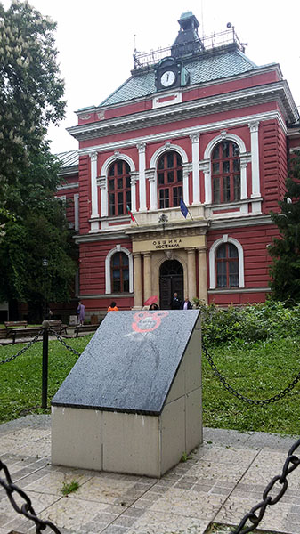 Тя е поставена в градинката пред община Кюстендил, а образът на кюстендилеца, свързан исторически с региона и загинал през 1943 година е изрисуван с червена боя.