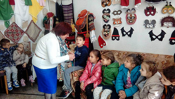 Изложбата включва народни носии, кукерски маски, пъстри шевици, дантели, амулети и муски изработени от сръчните ръце на майсторката. Еленка Славова показа нагледно на малчуганите как се преде и плете и им разказа за бита и културата на българите.