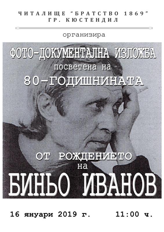На 16.01.2019 г. от 11:00 ч. в читалище „Братство 1869” гр. Кюстендил ще бъде открита фото-документална изложба по повод 80-годишнината от рождението на Биньо Иванов – поетът, свързал трайно съдбата си с нашия град. Изложбата съдържа стихосбирки на автора, книги, посветени на него, както и архивни снимки от неговия живот. В началото на тази година бе обявено Тринадесетото издание на поетичния конкурс, носещ името на Биньо Иванов.