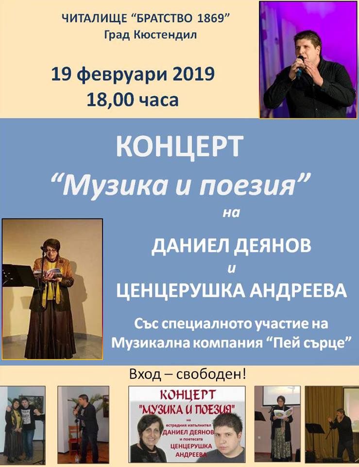 На 19 февруари 2019 г. от 18:00 ч. в Синята зала на читалище „Братство 1869” – гр. Кюстендил ще се проведе концерт „Музика и поезия” с участието на естрадния изпълнител Даниел Деянов, поетесата Ценцерушка Андреева и специалното участие на Музикална компания „Пей сърце”.