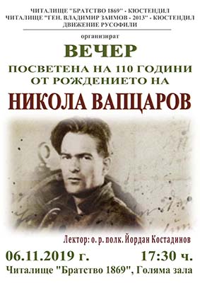 На 6 Ноември 2019 г. от 17:30 ч. в Голямата зала на читалище „Братство 1869” ще се проведе вечер посветена на 110 години от рождението на Никола Вапцаров.