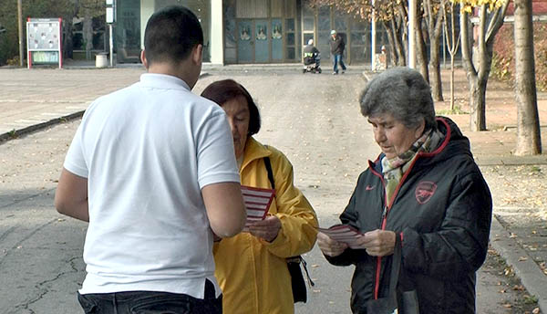 В Кюстендил доброволци на Българския червен кръст раздават донорски карти.