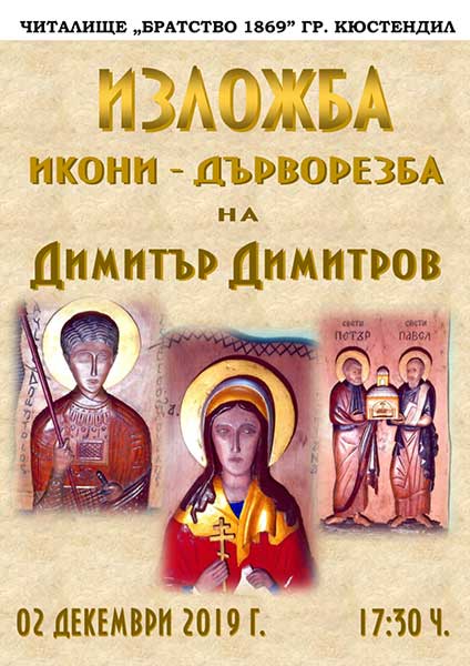 На 2 Декември 2019 г. от 17:30 ч. в читалище "Братство 1869” град Кюстендил ще бъде открита изложба от икони-дърворезба на Димитър Димитров.