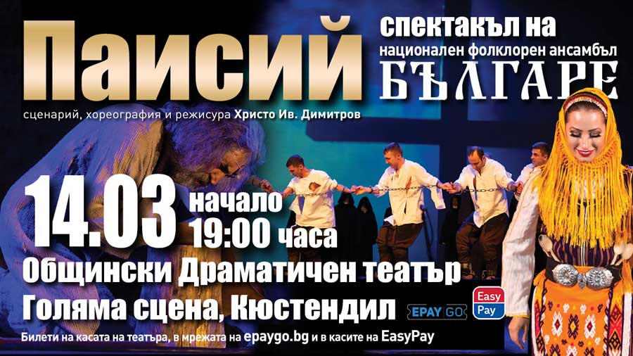 Спектакълът "ПАИСИЙ" представя знакови събития от историята на българите, последвали появата на най-българската книга. Зрителите ще съпреживеят героичните моменти от нашето минало, вълнуващо пресъздадени от невероятните танцьори на ансамбъл "БЪЛГАРЕ". "ПАИСИЙ" е разказ за събуждането на гордостта и достойнството на народа ни, на българския дух и възвърнатата българска чест, която държи гръбнака ни изправен.