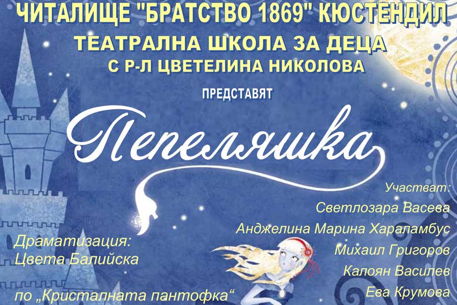 На 7 май 2024 г. от 19:00 ч. на сцената на читалище „Братство 1869“ гр. Кюстендил ще бъде представена театралната постановка „Пепеляшка“ с участието на Театрална школа за деца към читалището с ръководител Цветелина Николова. Драматизация - Цвета Балийска, по „Кристалната пантофка“ от Тамара Габе. Сценография: Георги Славков.