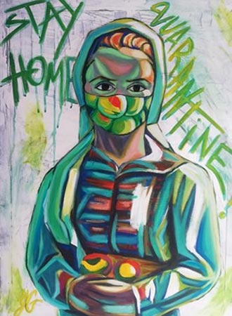"Картината е репродукция на картина на Майстора - Девойката в ябълкова градина. Както виждате, ябълковата градина вече я няма, отзад е една бяла изстъргана стена, ябълките ги няма, пише "Карантина" и "Стой си вкъщи" и фона вече е свит в маската на лицето и. Посланието е изолацията и стоенето вкъщи. Как действа на всеки един човек. Опитвам се да накарам хората да почувстват нещо когато виждат тези картини, да им напомня за нещо." разказва Йордан Георгиев.