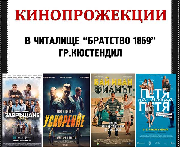 На 19 февруари 2022 г. /събота/ в читалище „Братство 1869“ гр. Кюстендил ще се проведат прожекции на няколко филма, както следва: