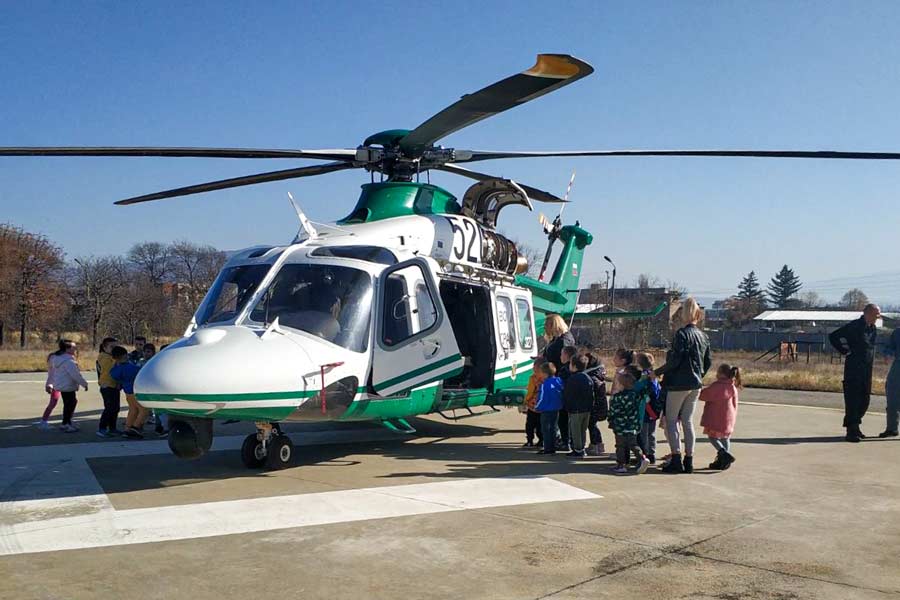 Те посрещнаха с възторг хеликоптера на Специализирания отряд за въздушно наблюдение на ГДГП, който кацна на площадката на дирекцията, за да приеме малките гости. След като пилотът им разказа какви задачи изпълняват летците с него, те наблюдаваха с нескрит интерес майсторската програма при облитането на площадката.