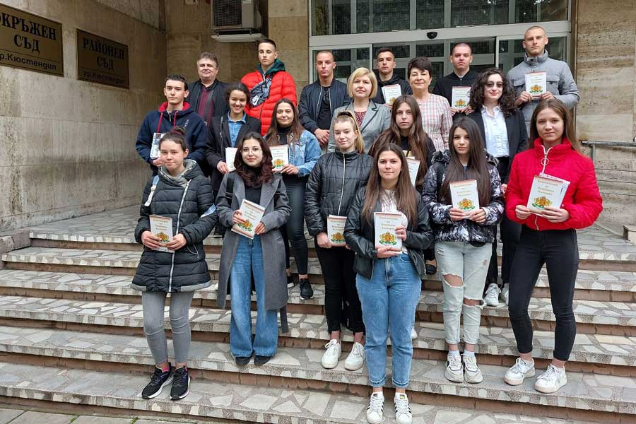 Учениците бяха приветствани с „Добре дошли“ пред Съдебната палата от председателя на Окръжен съд – Кюстендил, съдия Пенка Братанова, заместник – окръжния прокурор Марияна Сиракова и младши съдия Мария Танева. Те бяха публика в съдебна зала и наблюдаваха въззивни наказателни дела, с предмет измама и нанасяне на средна телесна повреда. Съдебният състав, който разглежда делата бе в състав: Съдия Пенка Братанова – председател и членове – съдия Мирослав Начев / зам.- председател на съда / и съдия Елисавета Деянчева. Прокурор Валери Пенков представлява Окръжна прокуратура.