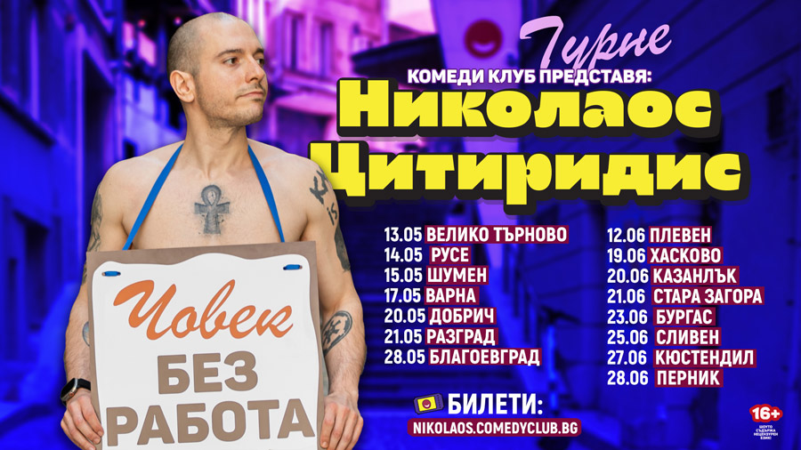 Известният комедиант и тв водещ Николаос Цитиридис ще представи най-новото си шоу „Човек без работа“ на сцената на читалище „Братство 1869” Кюстендил. Той се завръща към стендъп комедията с турне във всички големи градове в страната.